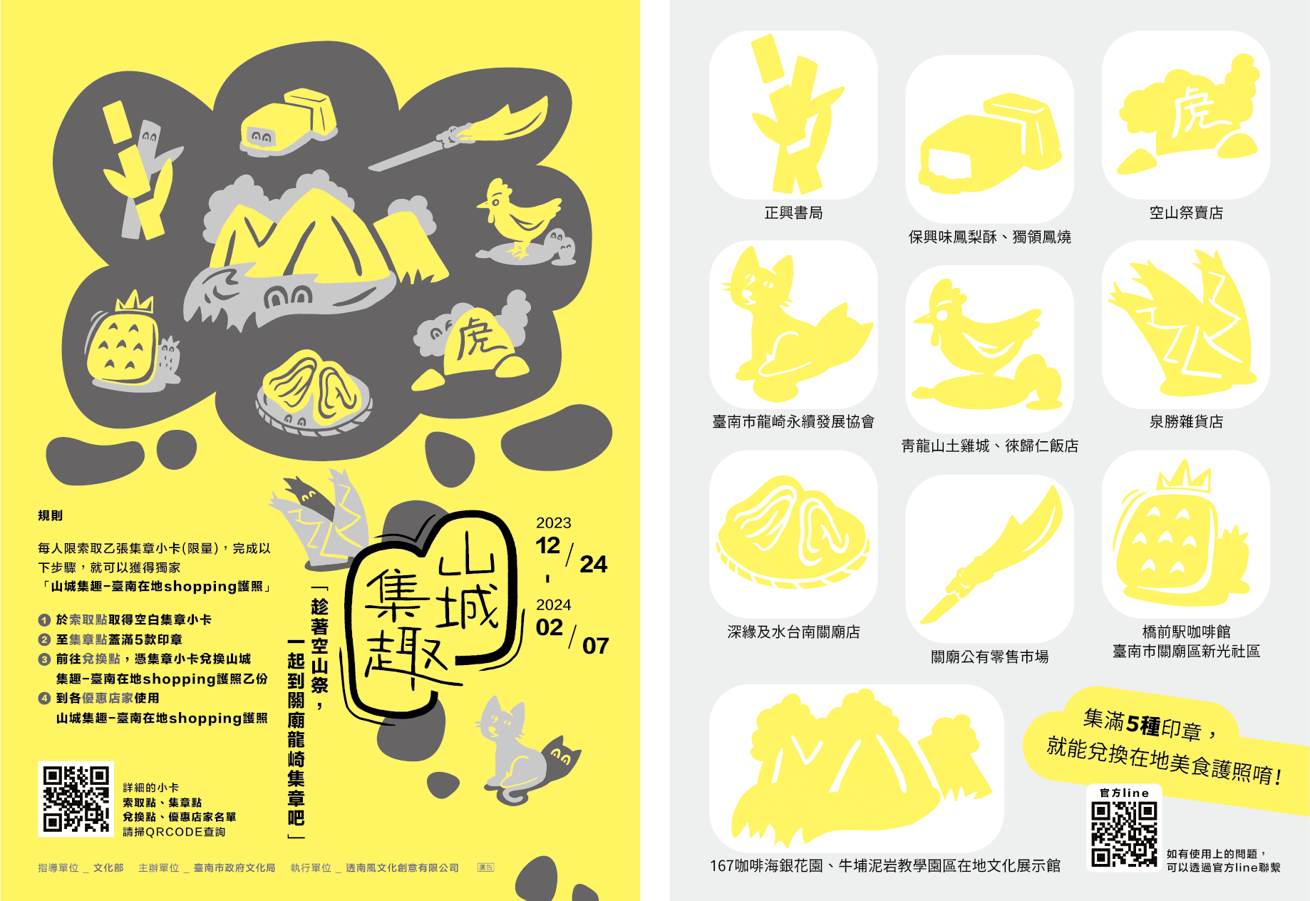 至集章點蓋滿5款印章 (總共有10款,分佈在14處),前往兌換點,憑集章小卡兌換山城集趣-臺南在地shopping護照乙份。